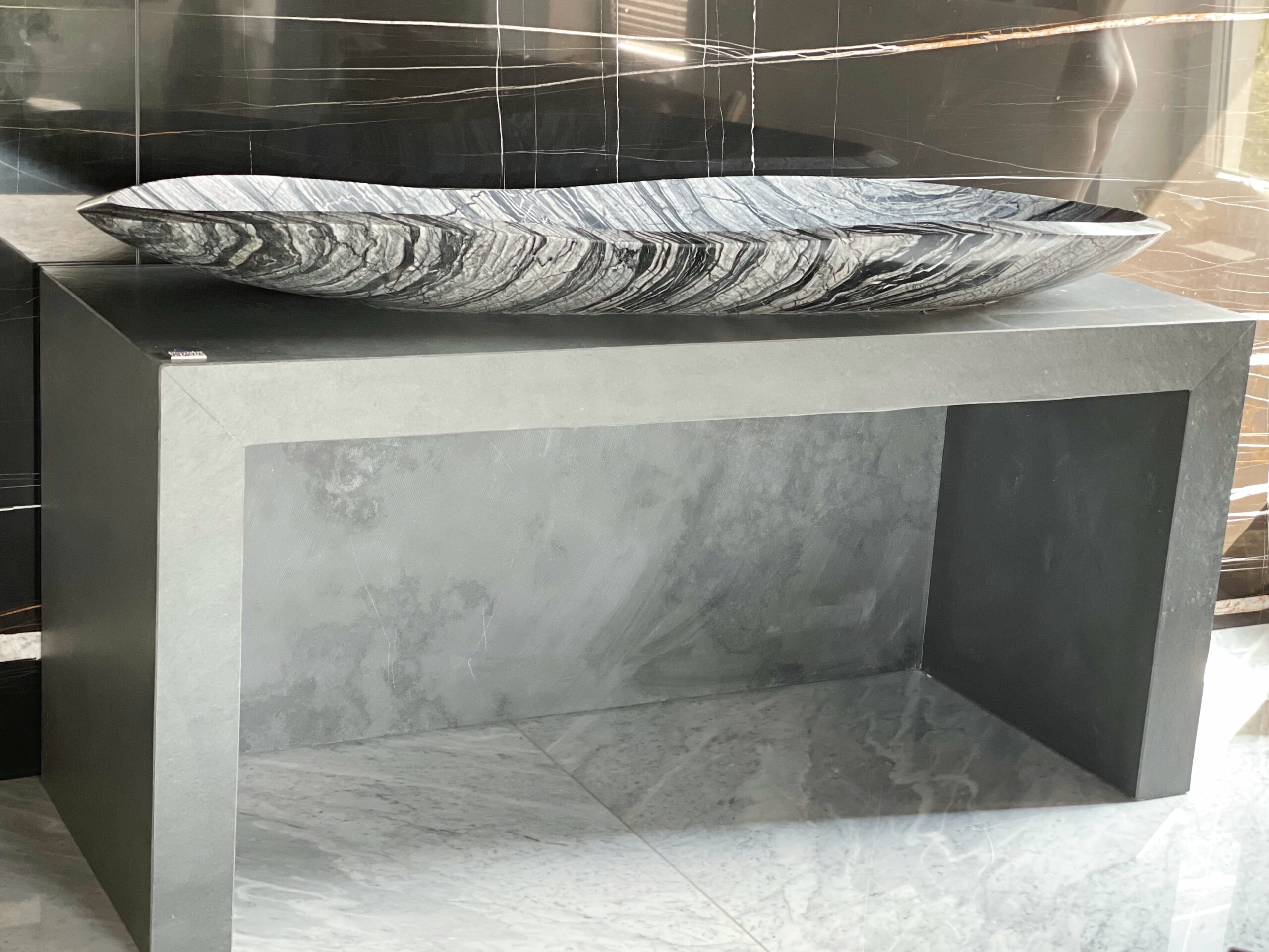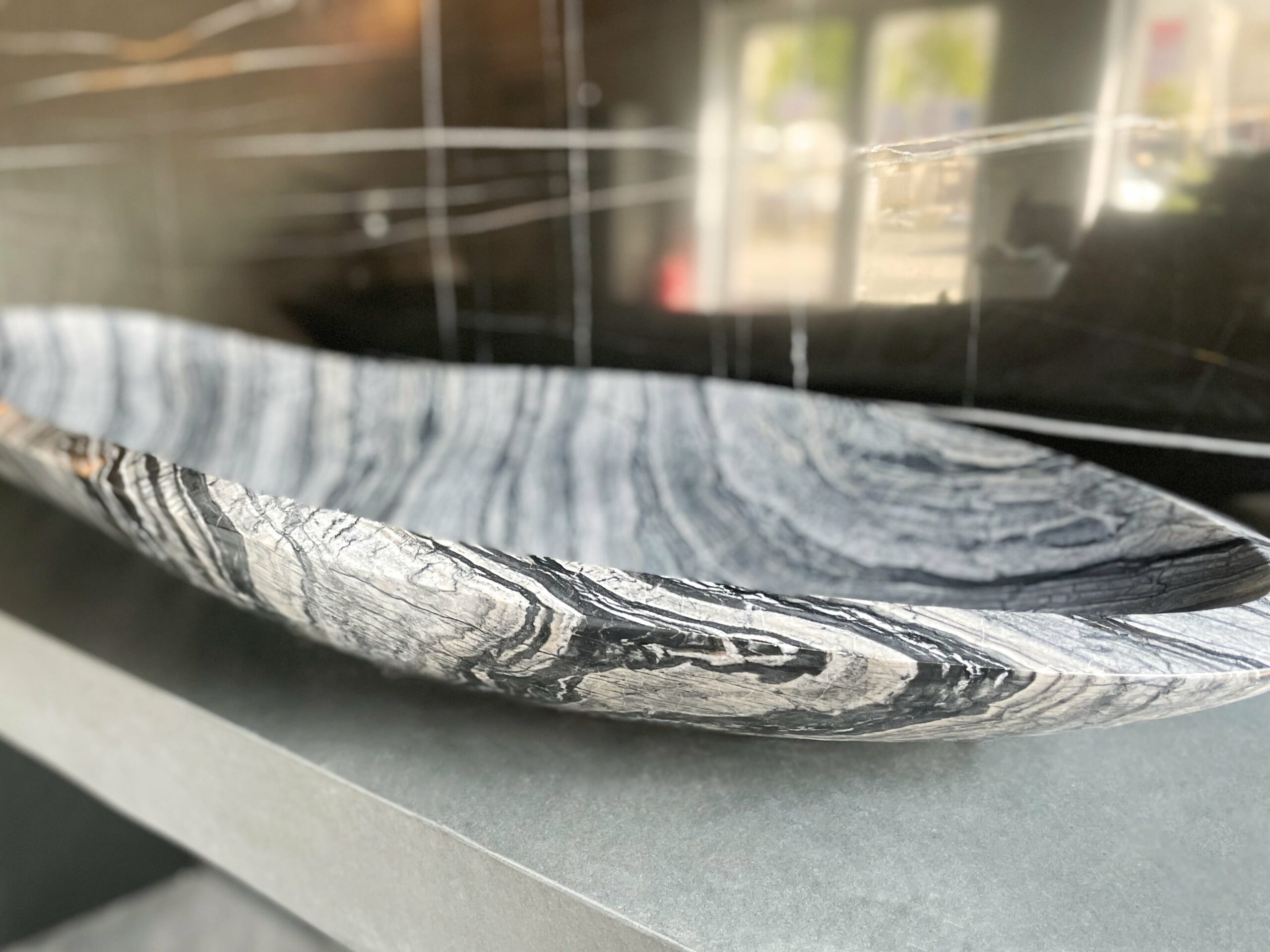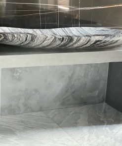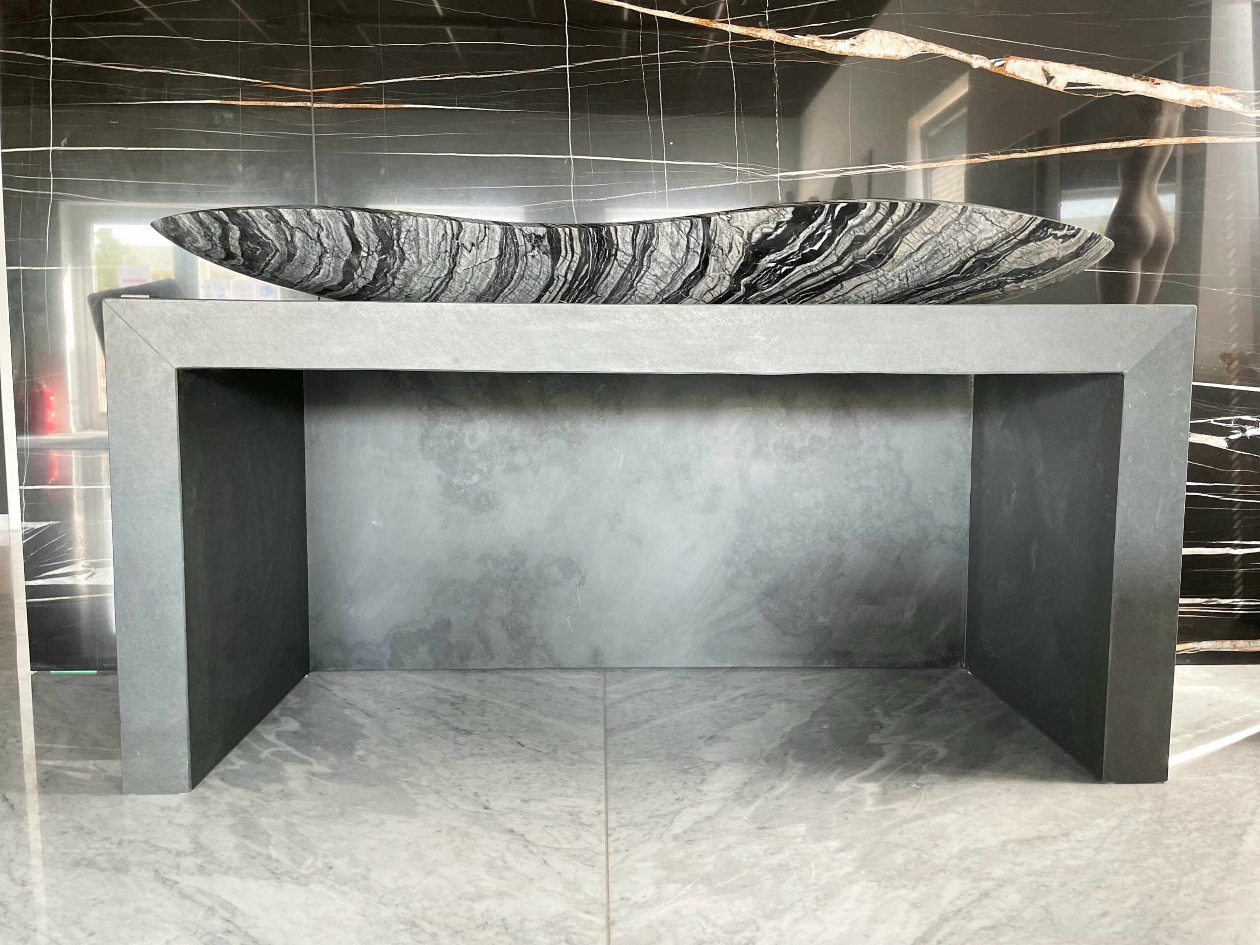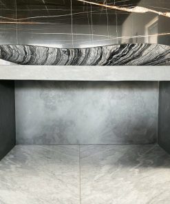 Die Waschtischanlage CURVING CREEK besteht aus einem ovalen Waschbecken auf einem außergewöhnlichen Unterbau. Der wunderschöne Marmor Silver Wave windet sich wie der geschwungene Lauf eines Flusses durch die Landschaft. Seine Farbgebung aus schwarz und weiß mit seiner länglichen und ovalen Form verleiht dem Waschtisch ein unvergleichliches Design und Ambiente.