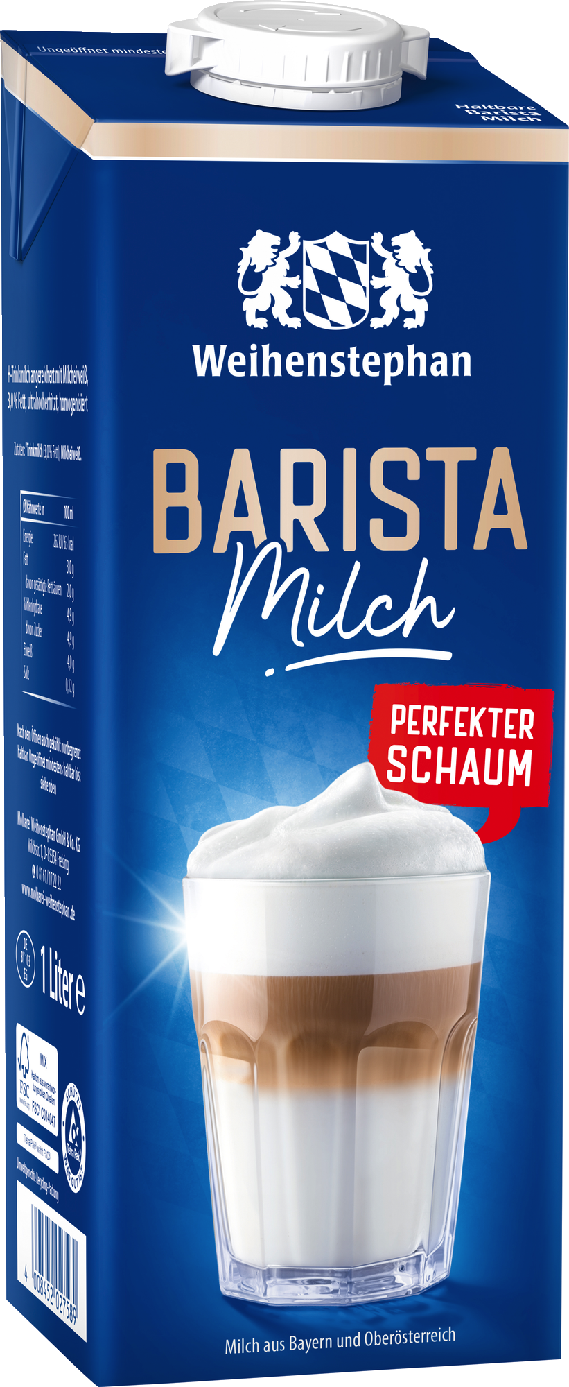 Die Weihenstephan Barista Milch vollendet Ihre Kaffeekreationen wie von Meisterhand. Durch das besondere Verhältnis von drei Prozent Fett und vier Prozent Milcheiweiß lässt sie sich hervorragend und einfach aufschäumen mit dem Milchaufschäumer, dem Dampfstab oder dem Kaffeevollautomaten. Sie garantiert stabilen, feinporigen, voluminösen und leckeren Milchschaum.